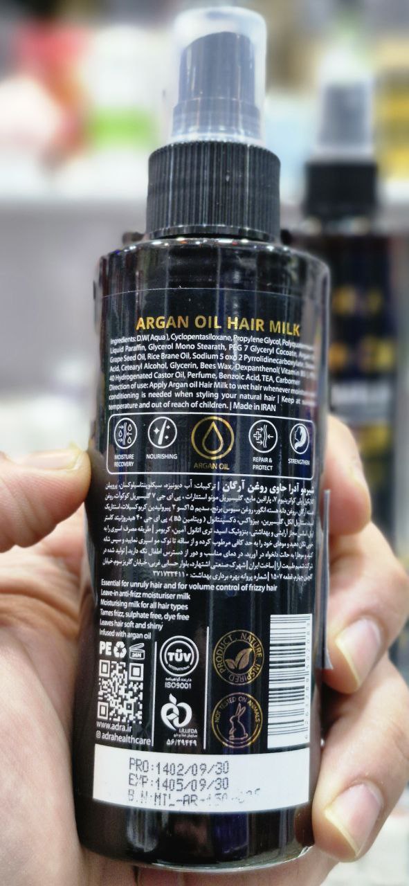 ویژگی های شیر مو آدرا حاوی روغن آرگان مناسب انواع مو و مخصوصا موهای خشک دارای پروتئین هیدرولیز شده شیر ضد موخوره و دوشاخه شدن مو آبرسان و مرطوب کننده قوی نرم کننده و درخشان کننده بدون نیاز به آبکشی حاوی روغن آرگان 💸